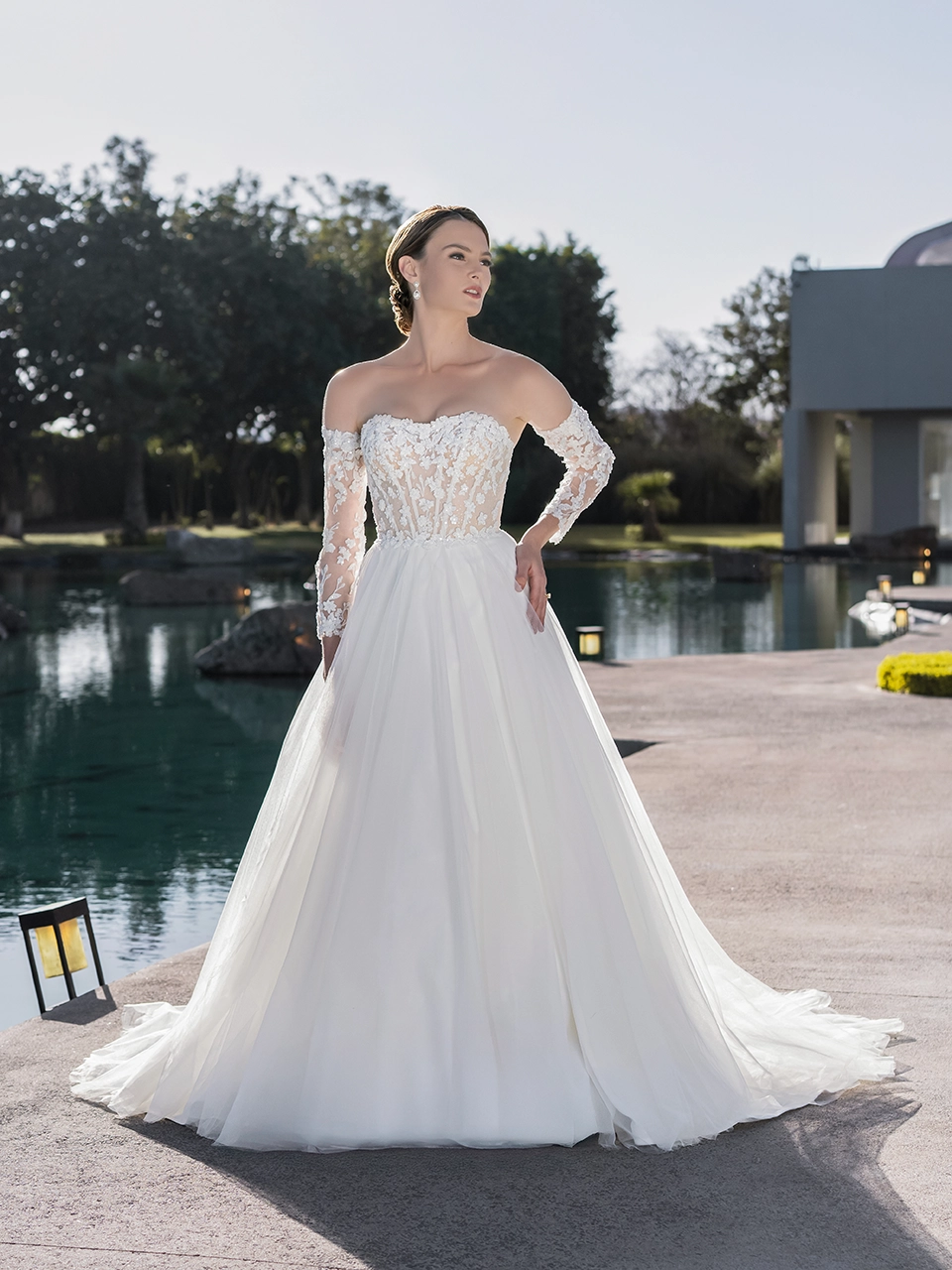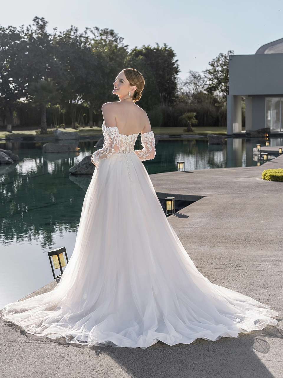 Confeccionado en tul, talle nude en transparencia con entre capa de tul moteado glitter. Aplicaciones bordadas al hilo y pedrería con detalle de flores 3D en talle y cintura. Mangas largas desmontables del mismo diseño que el vestido.