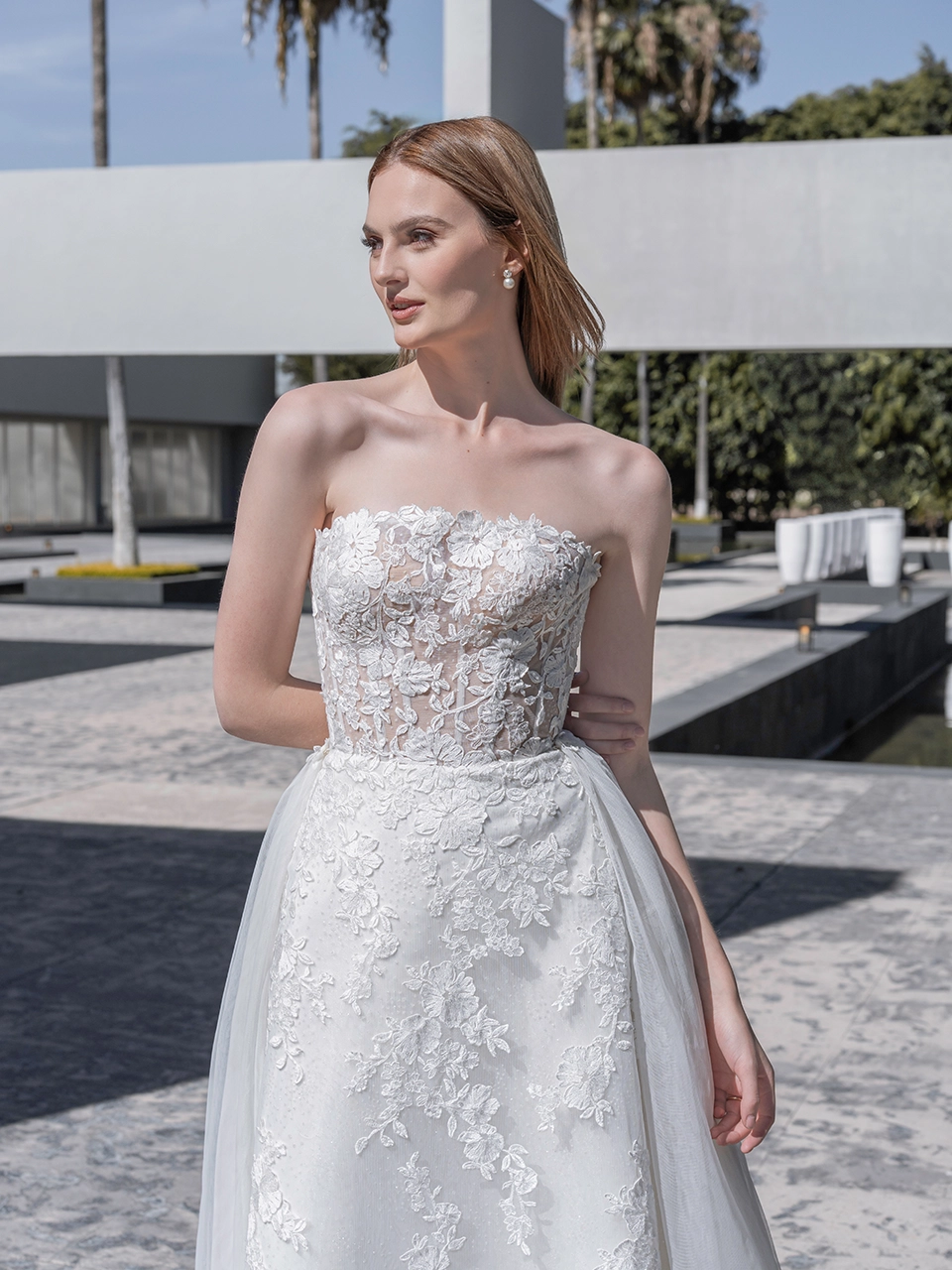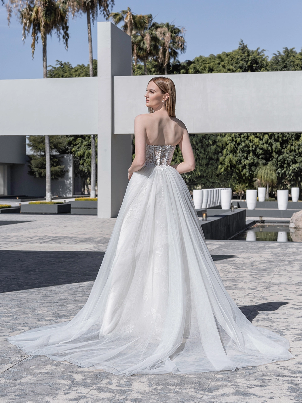 SKU EG12Vestido línea A sin cauda con sobrefalda de tul desmontable.
