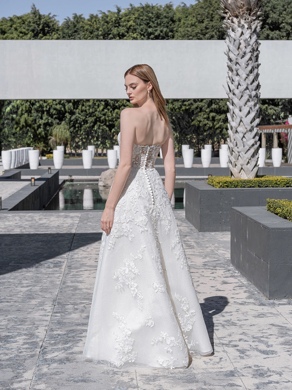 Talle en transparencia con escote palabra de honor, espalda media con botonadura. Confeccionado en tul, entre capa de tul moteado glitter. Decorado con aplicaciones bordadas al hilo y lentejuela transparente. Cauda desmontable de tul con aplicaciones en cintura.