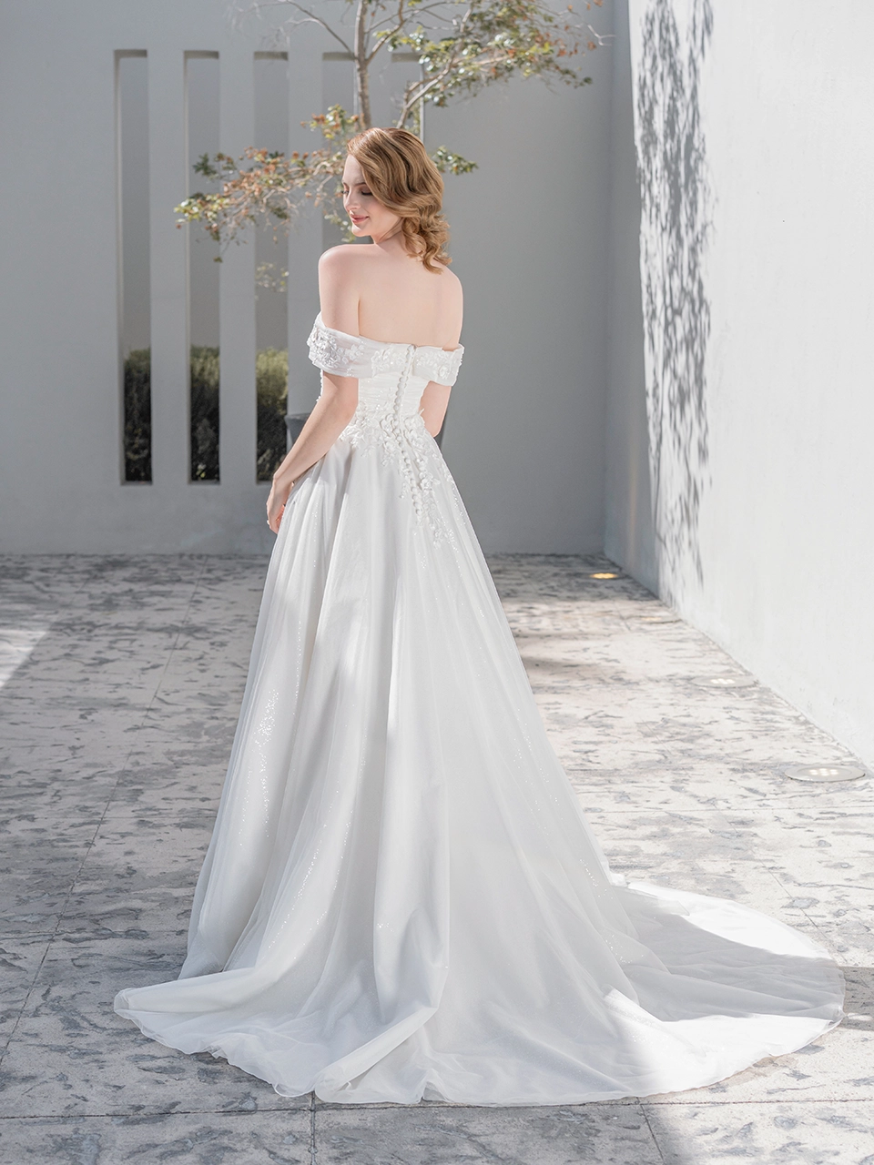 Espalda media con botonadura. Confeccionado en tul, con entre capa de tul glitter, decorado con aplicaciones bordadas al hilo y lentejuela, aplicación 3D. Talle con diseño drapeado cruzado.