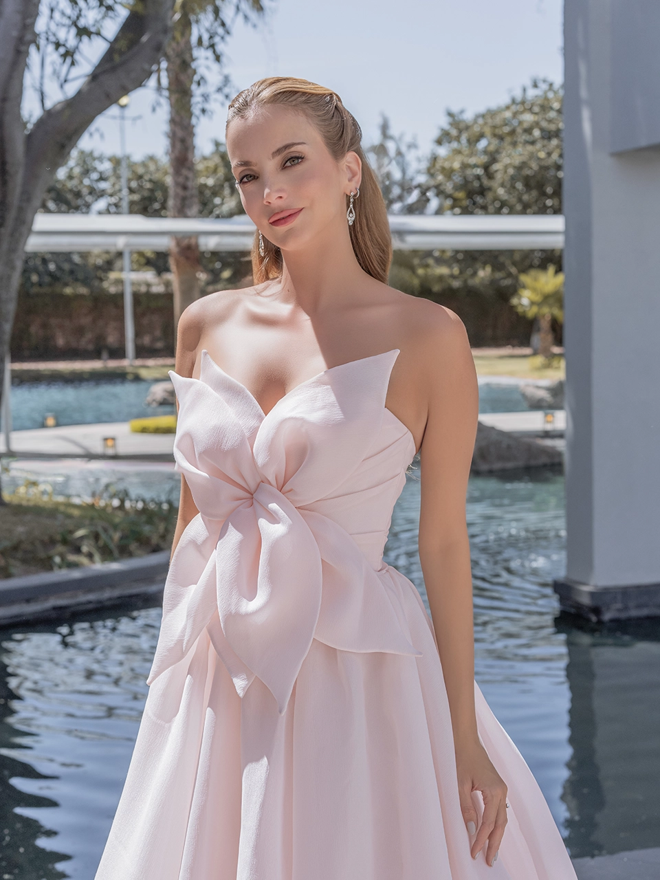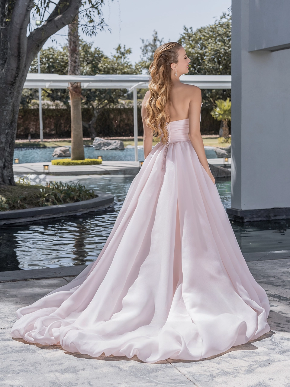 Escote corazón y espalda media. Confeccionado en malla de organza, falda y cauda globo, talle drapeado y flor grande. Botonadura en espalda.