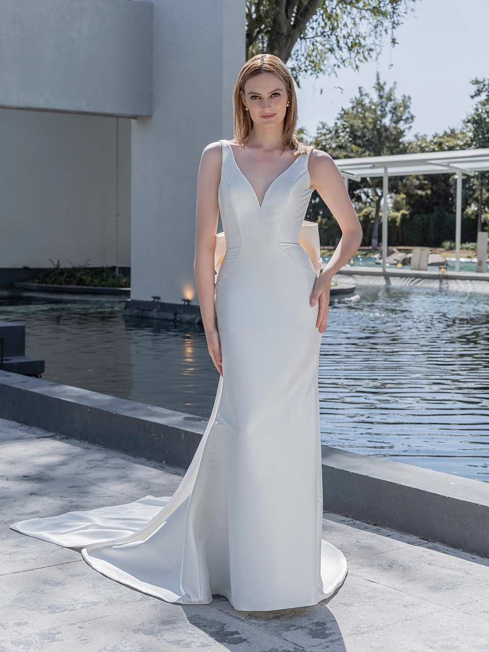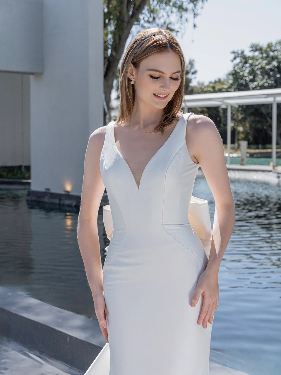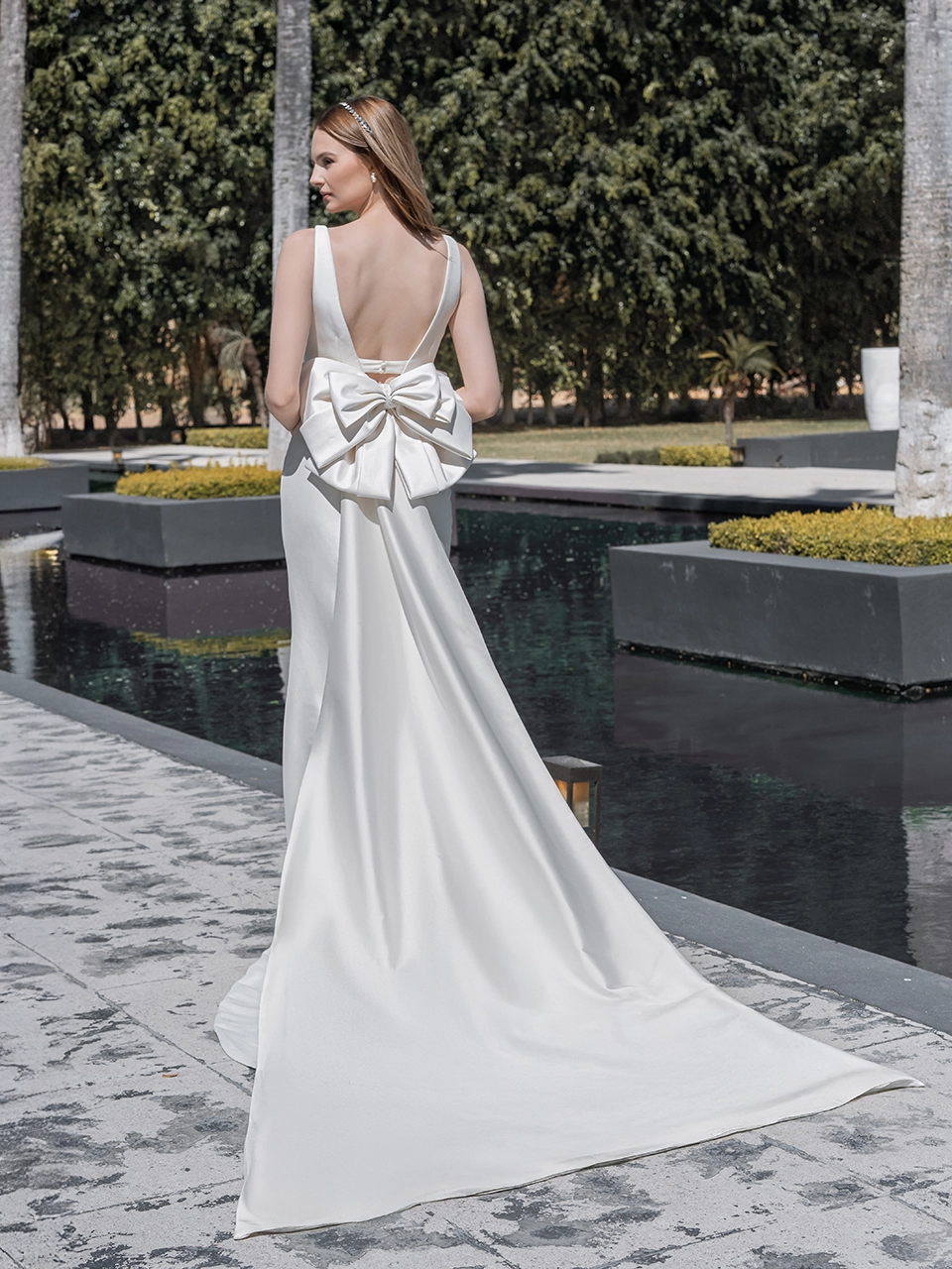 SKU EG29Vestido de novia corte sirena con cauda y moño desmontable,