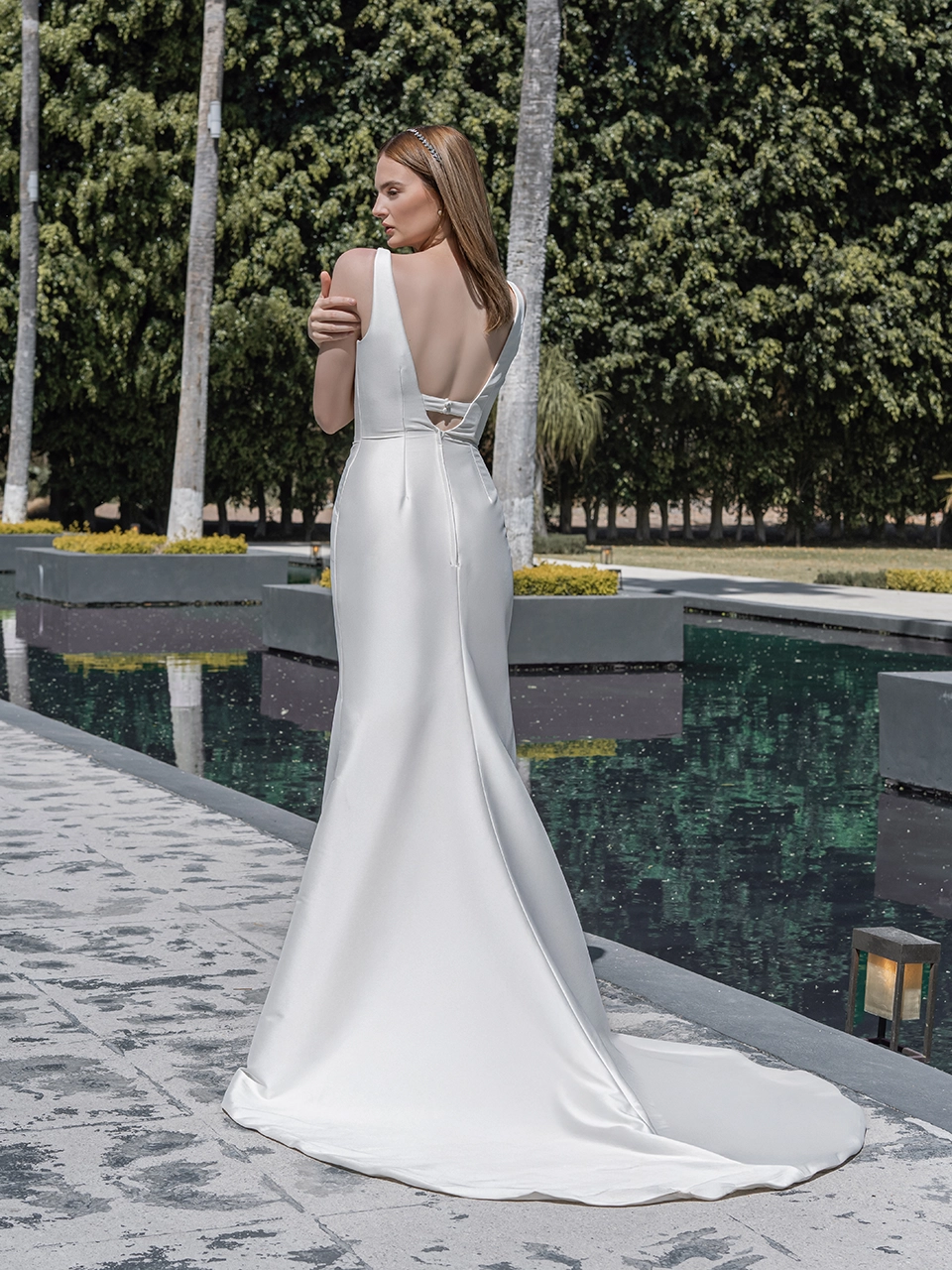 Escote V, confeccionado en mikado, espalda baja con detalle de tira con botón y cierre. Cauda y moño desmontable de mikado con aplicación bordada en pedrería y cristal en el centro.