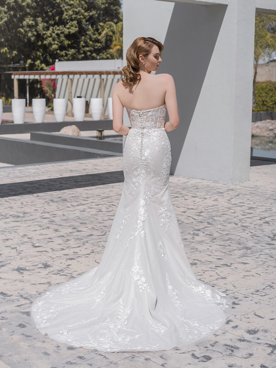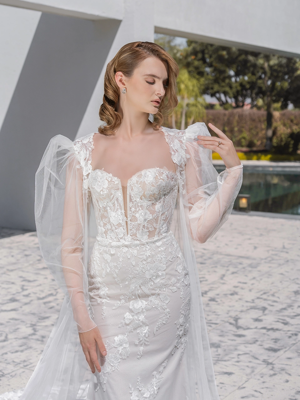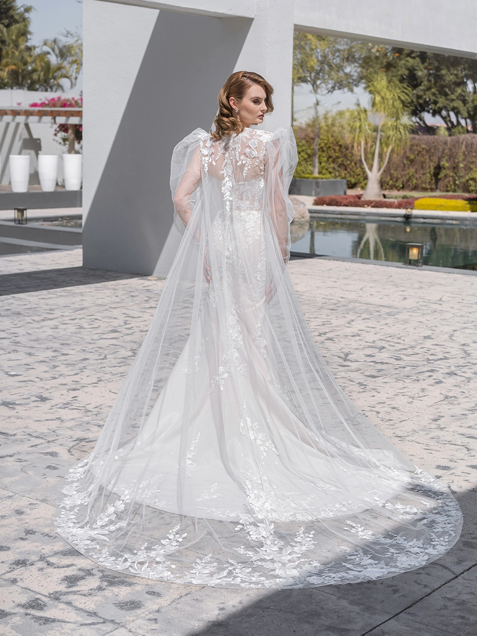 Vestido corte sirena strapless confeccionado en tul, glitter, aplicación bordada al hilo y lentejuela. Capa de manga larga abullonada y cauda larga, con acentos en aplicación de hilo y lentejuela.