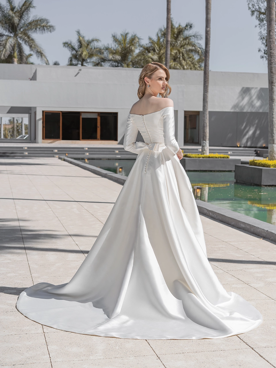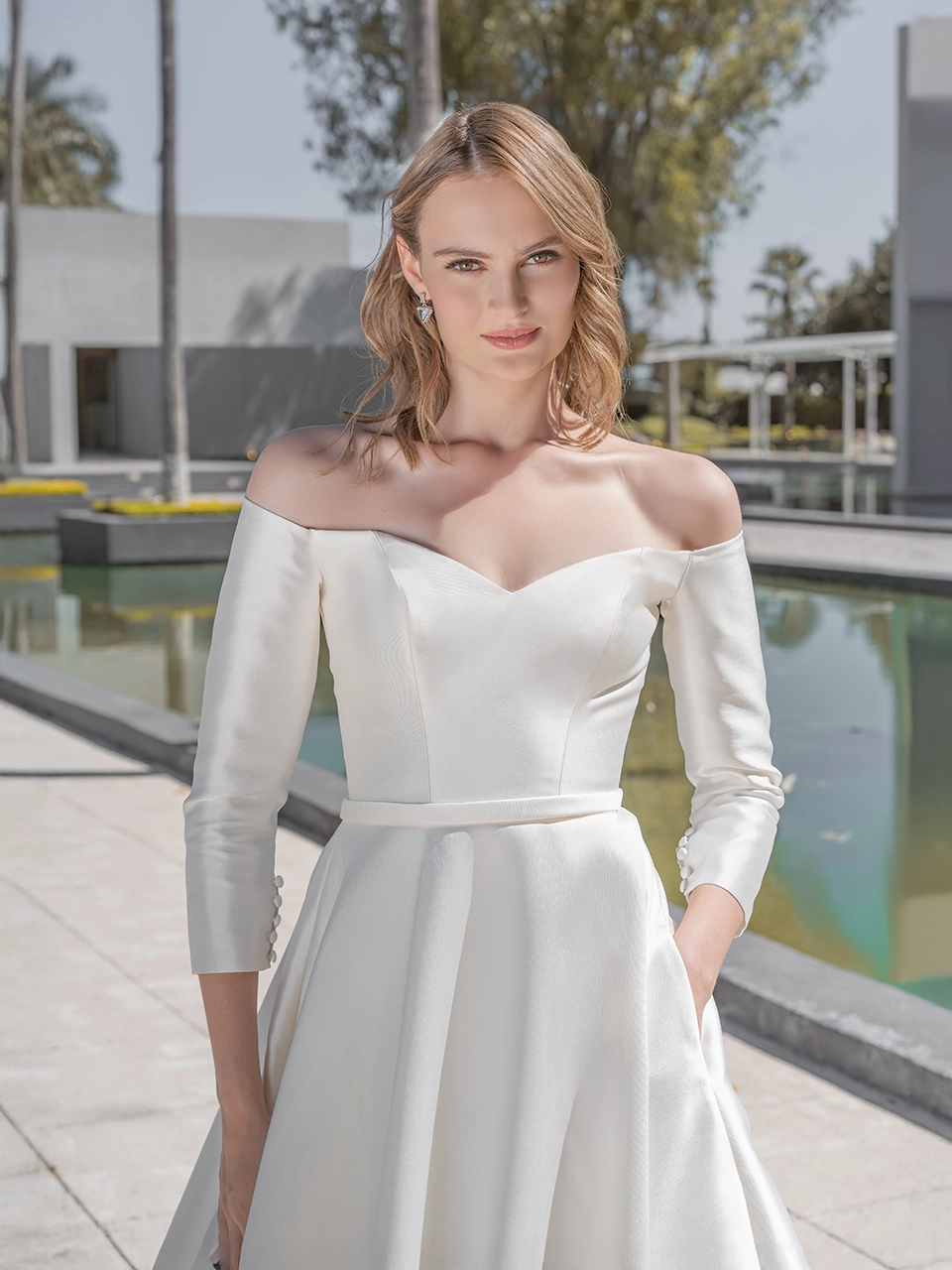 Espalda media, cierre y botones. Confeccionado en mikado, cinturón liso con moño pequeño desmontable, bolsas ocultas.